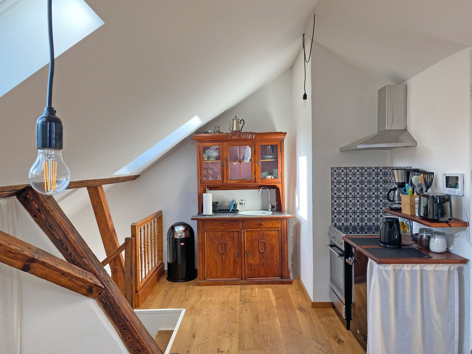 The attic TLA apartment Franz is a cozy one-room retreat filled with natural light and charming exposed wooden beams. A small built-in vintage kitchen blends seamlessly into the historic setting, while a thoughtfully crafted bed made from historic oak beams adds to the apartment’s unique character. Warm, inviting, and full of charm, this apartment is an ideal choice for anyone seeking a comfortable and distinctive place to stay.